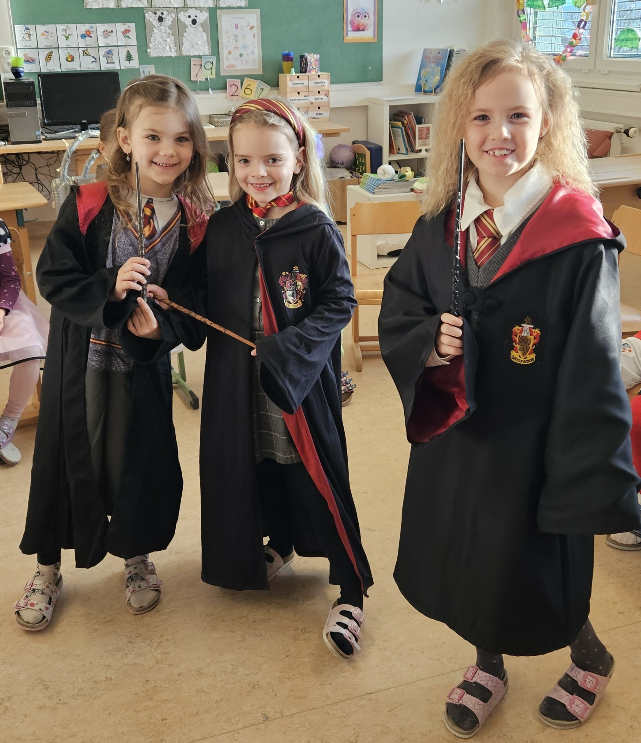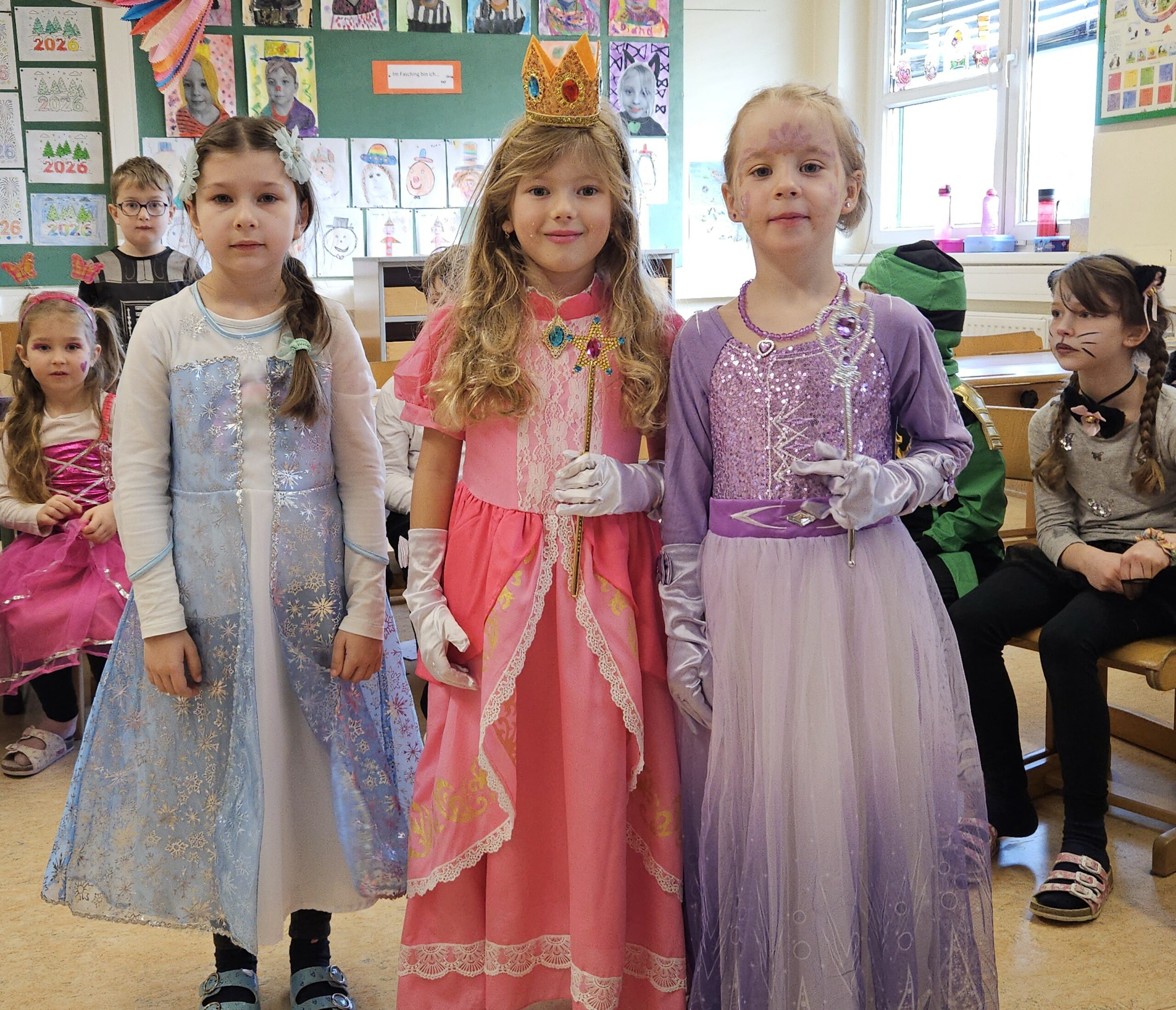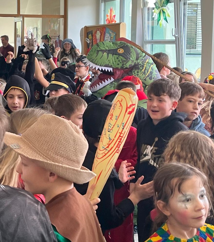 Am Freitag vor den Ferien wurde in unserer Volksschule ausgelassen Fasching gefeiert, da der Faschingsdienstag heuer in die Ferienzeit fiel. Schon am Morgen kamen die Kinder in ihren fantasievollen Verkleidungen zur Schule. Von Prinzessinnen, Elfen, Astronauten, Ninjas, Meerjungfrauen, Cheerleadern, Fußballern … über Superhelden bis hin zu Tieren, einem Riesendino, dem lustigen Pumuckl und Pippi Langstrumpf, Polizisten und vielen weiteren kreativen Kostümen war alles vertreten.