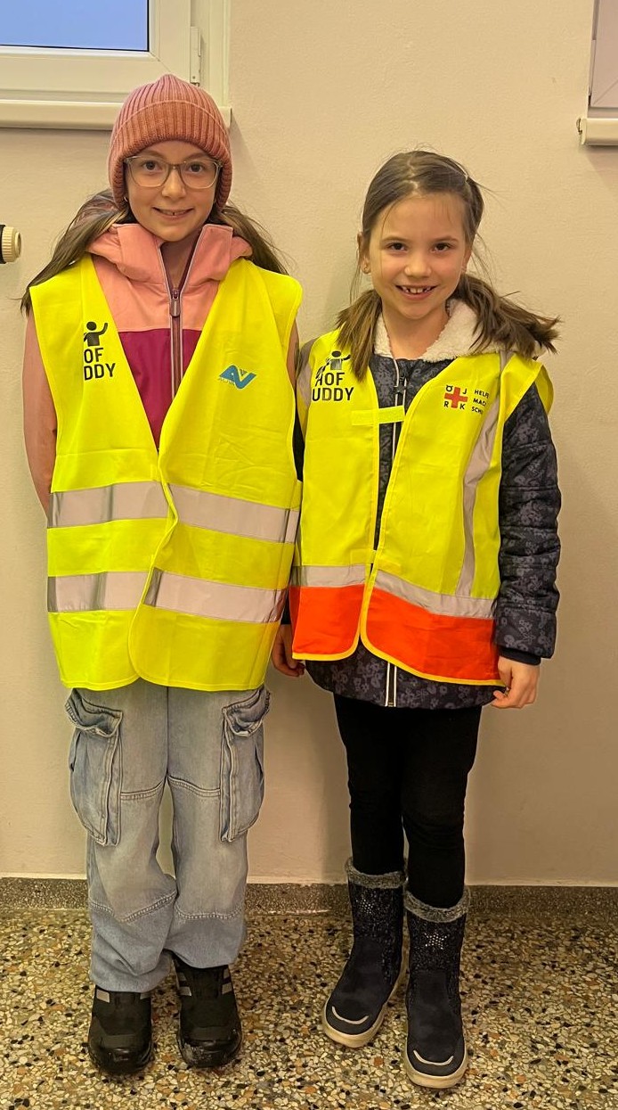 Ein Wunsch der Kinder, Buddys für die Pause zu installieren, wurde bereits mit dem zweiten Semester umgesetzt. Die Buddys sorgen in der Garderobe und im Pausenhof dafür, dass alle Kinder eine erholsame Pause erleben können. Sogar ein eigenes LOGO für die Schutzwesten der Kinder wurde dafür entworfen und mit Hilfe eines Vaters auf die Schutzwesten gedruckt- herzlichen DANK!